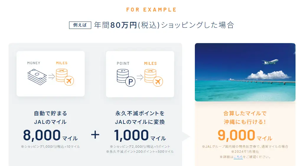 SAISON MILE CLUBに登録すると、「1,000円のご利用で10マイル(JALのマイル還元率1.0%)」+2,000円の利用で永久不滅ポイント1ポイント(JALのマイル還元率0.125%)」が貯まります。